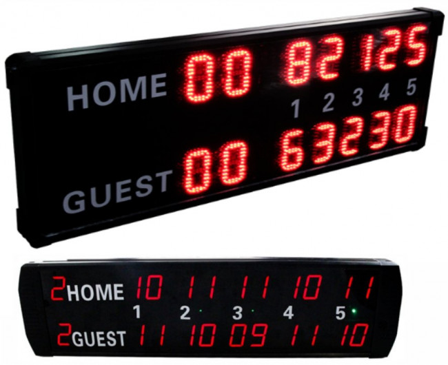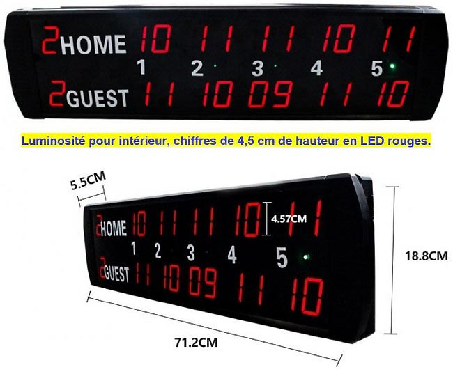 Scores programmables par la télécommande à infrarouge (fournie avec le panneau) portée maxi en champ libre 10 mètres.