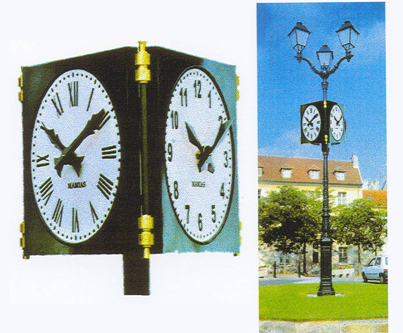 -horloge se pose sur un candelabre en fonte le modele choisie par le maitre de louvrage ne depasse Quatre a cinq metre de hauteur avec bouquee quatre luminaires palaces eqmipee de lampes 250W sodiums et dune hauteur globale de six metres