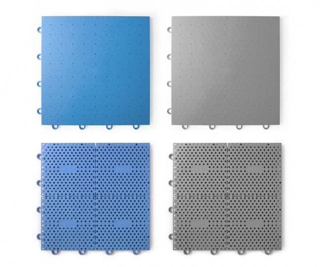 Il y a plusieurs gammes de dalles en fonction de l’usage : Dalles perforées et drainantes pour du sport en extérieur, et dalles pleines pour une surface en intérieur.