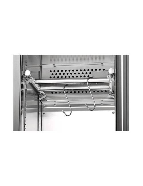 Avec ses grilles réglables et ses crochets de boucher, l'armoire s'adapte à différentes tailles et formes de morceaux de viande. La barre de suspension robuste permet de maximiser l'espace.