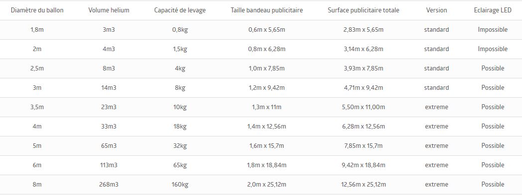- Sphère : 1,8 m, 2 m, 2,5 m, 3 m, 3,5 m, 4 m, 5 m, 6 m, 8 m