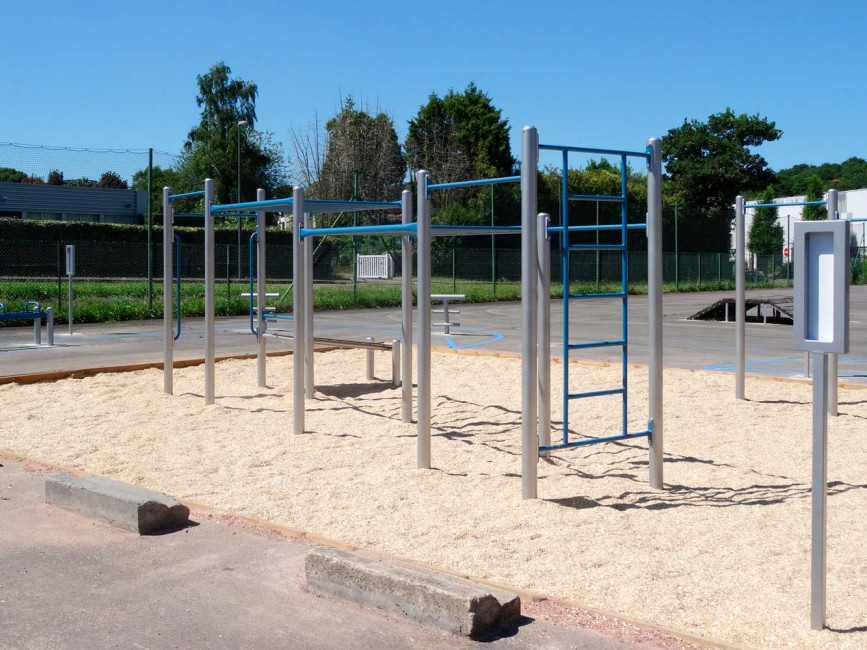 Poteaux en Gris Metalu, barres en Bleu RAL 5015. Texture au choix : lisse ou antidérapante. Une intégration esthétique dans tout parc sportif en plein air, avec un rendu moderne et attractif.
