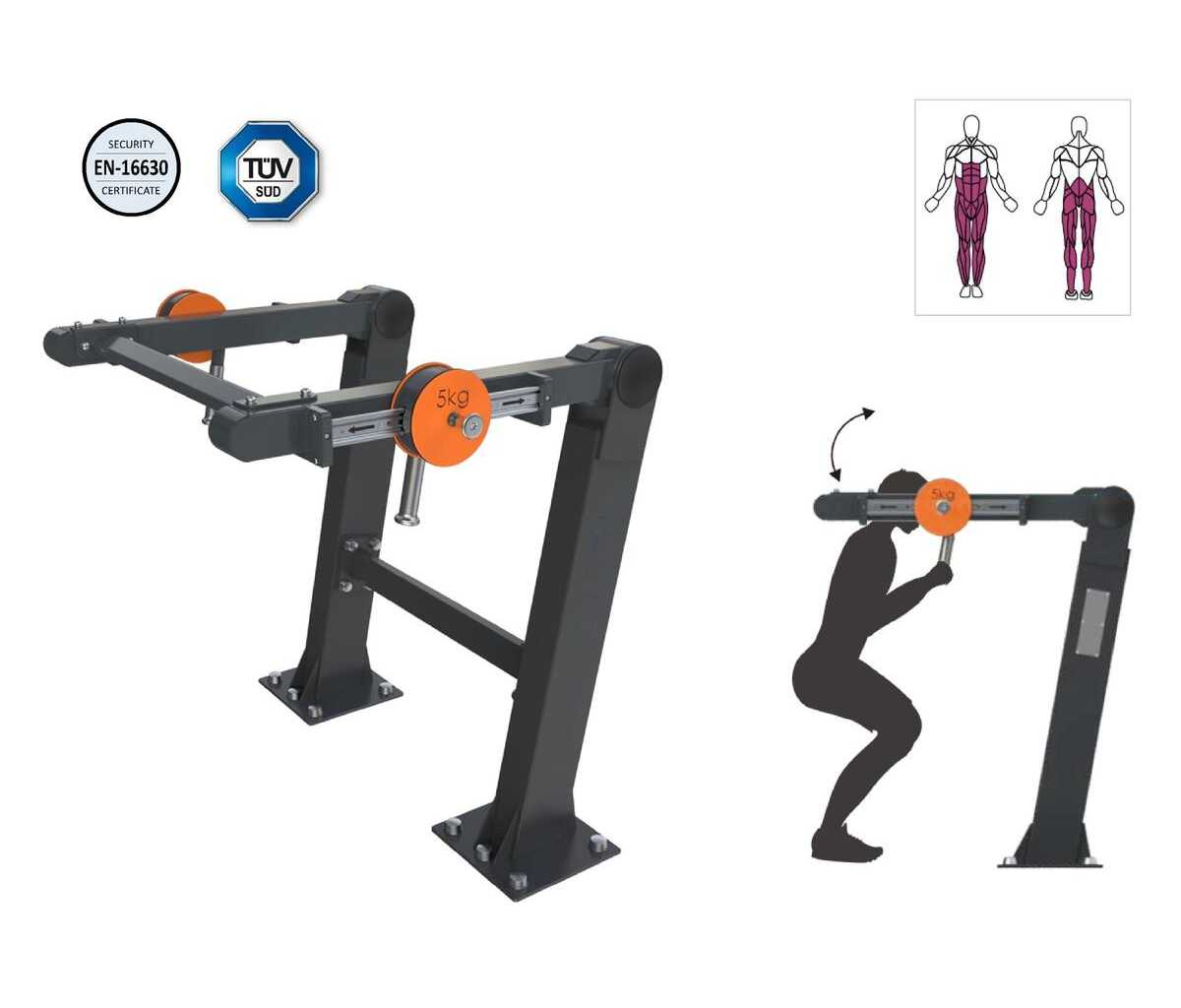 Conforme à la norme EN 16630:2015 relative aux équipements de fitness en extérieur sans surveillance.