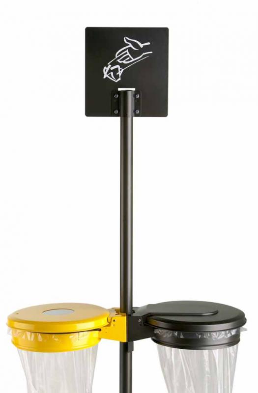 Ce totem zone collecte des déchets est un accessoire pour les poteaux 50 mm de diamètre, qui peut équiper 1, 2 ou 3 flux (support sac poubelle).