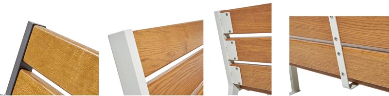 Les lames de l’assise, d’une largeur de 115 mm, sont disponibles en deux finitions esthétiques : lasurée, acajou ou chêne clair, permettant une intégration harmonieuse dans divers environnements.