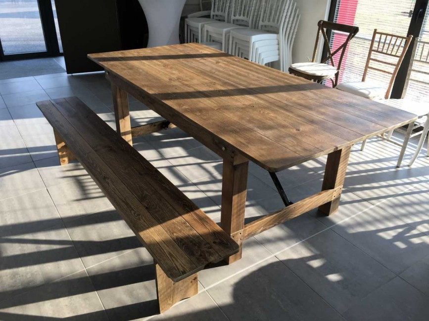 Ce banc rustique pliant en bois est adapté à des utilisations professionnelles avec des manipulations intensives.