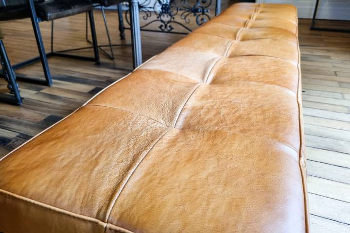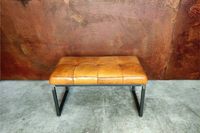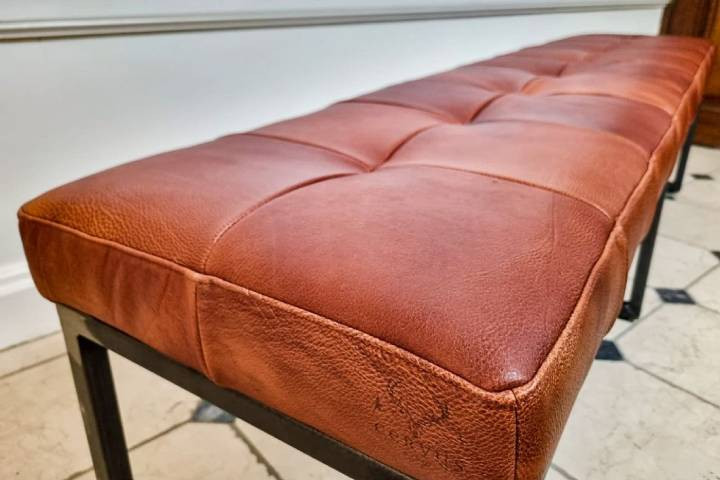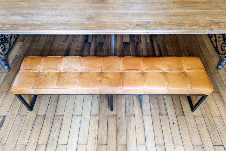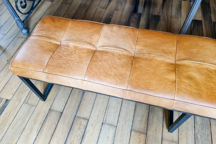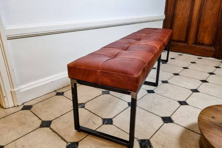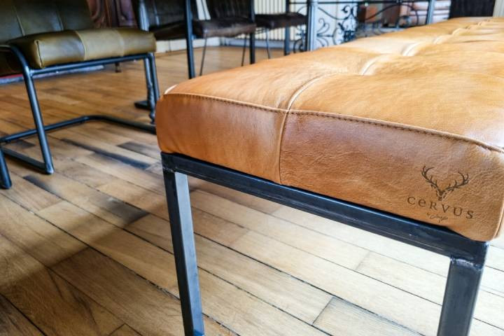 Avec ses lignes nettes et son absence de dossier, notre banc en cuir et métal s'intègre facilement sans surcharger votre décoration.