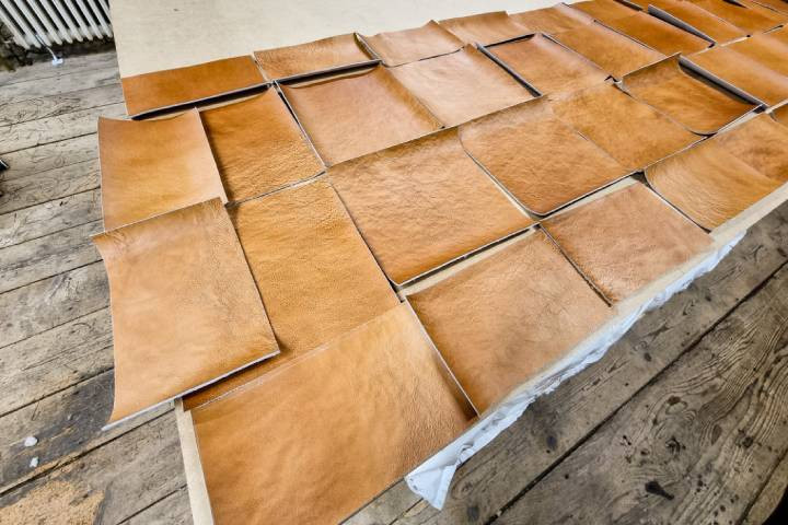 C’est un cuir naturel, sélectionné pour son grain irrégulier, sa souplesse et sa capacité à se patiner joliment avec le temps.