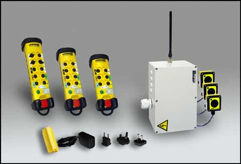 - Plus flexible que les boîtes à boutons reliées par câble et permet à l’opérateur de se placer à une distance de sécurité par rapport à la charge.