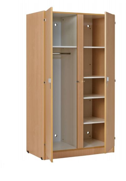 Une séparation médiane avec : - d’un côté une tablette haute fixe et 3 tablettes réglables - de l’autre côté une tablette haute fixe et une tringle indémontable pour le rangement des vêtements.