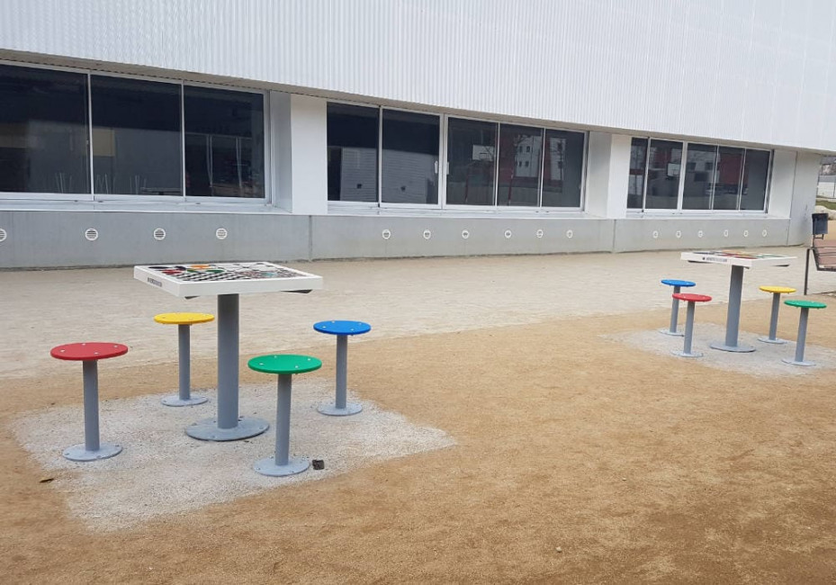 Table de jeux des petits cheveux pour extérieur, équipée de 4 sièges colorés avec dossier.