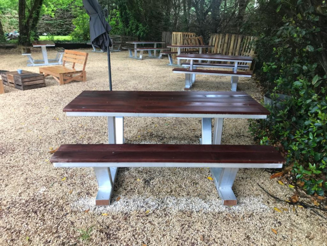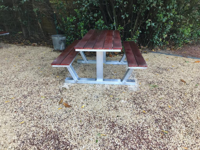 Cette table de pique nique au design tendance est très adaptée pour l'extérieur.