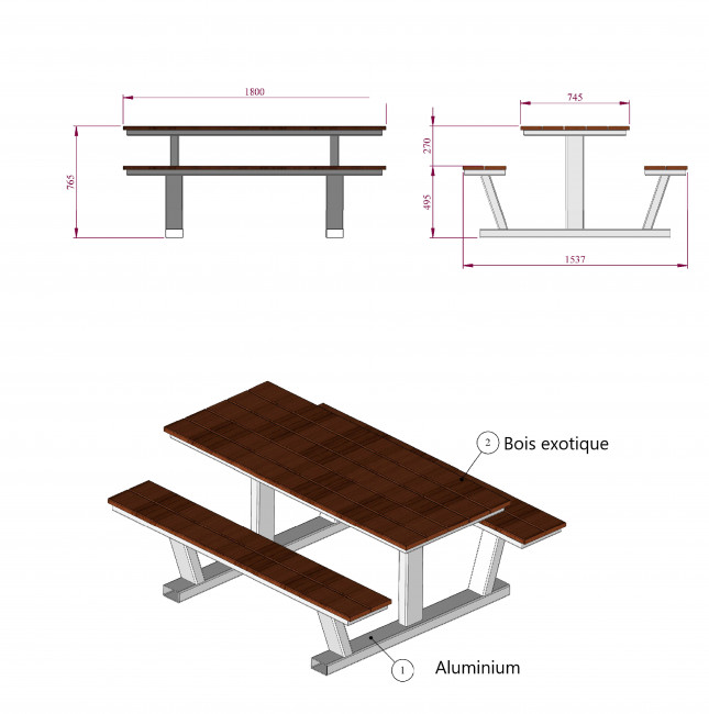 - En aluminium de qualité marine et en bois exotique la table résistera aux intempéries, UV et à la chaleur et ce pour plusieurs dizaines d'années.