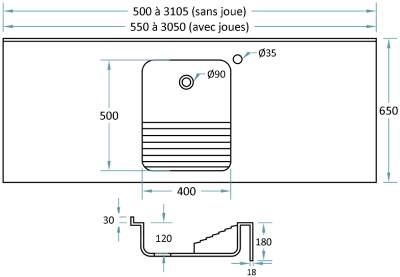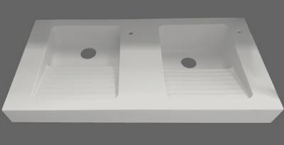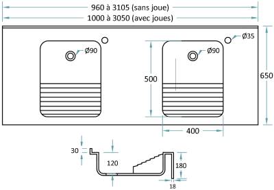 Plan simple ou double cuve Cuves centrées ou décentrées Avec ou sans trop-plein Trou de robinetterie sur plan ou en façade Hauteur du bandeau frontal jusqu’à 180 mm Coloris personnalisables Joues latérales de finition et angles à pan coupé.