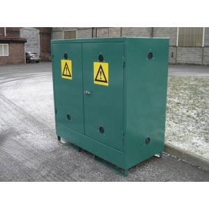 - Pour le stockage des produits polluants ou toxiques en extérieur. - Grande résistance à la corrosion, construction avec coiffe en tôle et bac de rétention galvanisés. - Entièrement fermés et sécurisés. Fermeture avec serrure à clé.
