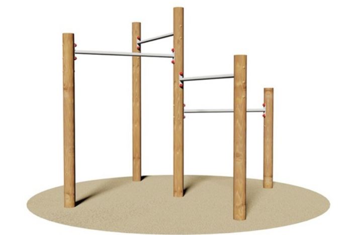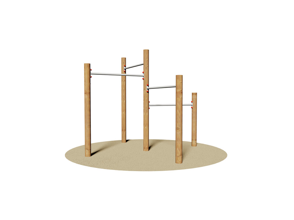 Ces barres de gymnastique forment une structure de jeux asymétriques en plein air pour enfants de 8 à 12 ans.