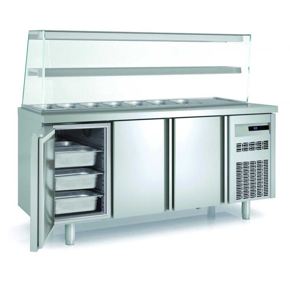 Vous disposez d’un véritable meuble de préparation réfrigéré qui combine stockage bas, vitrine à ingrédients et plan de travail, pour limiter les déplacements et accélérer la mise en place.