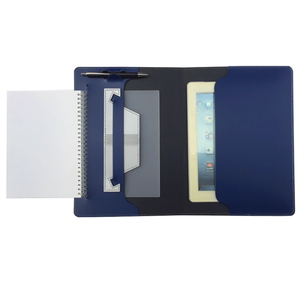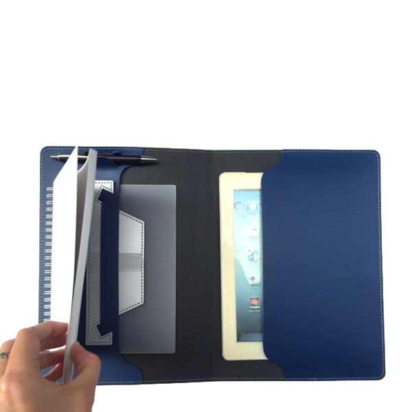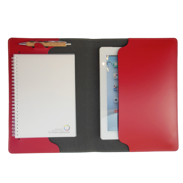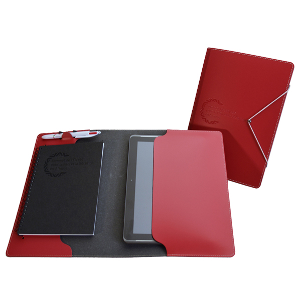 Ce Conférencier en cuir recyclé (synderme) est prévu pour accueillir une tablette tactileet son support ainsi qu'un cahier à spirale format A5 et un stylo, grâce à ses poches et encoches intérieures.