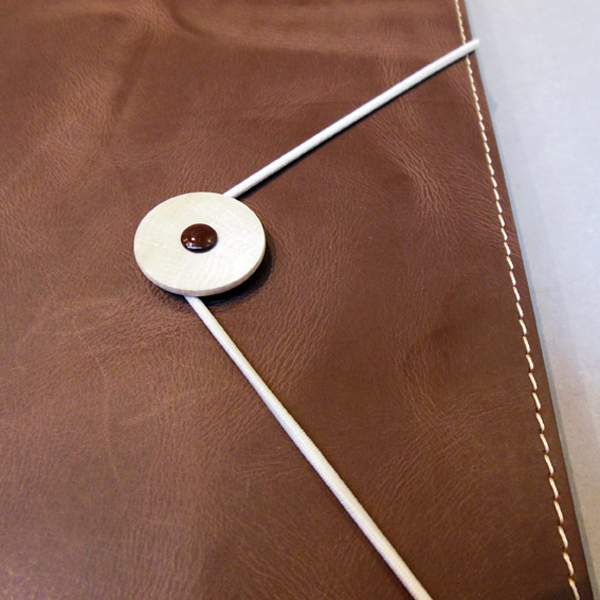 Il se ferme par un élastique autour d'un bouton de col métallique ou d'un bouton en bois ou encore autour d'une rondelle cuir. Finitions couture sellier.