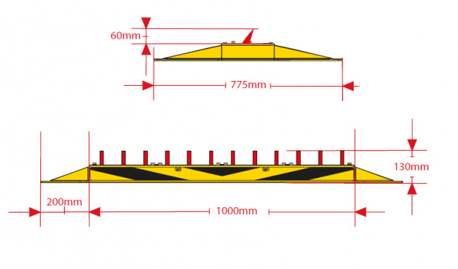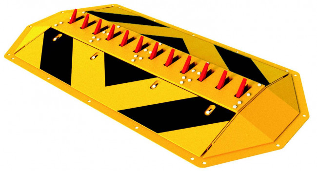 Herse manuelle de surface conçue pour empêcher tout accès forcé et non autorisé d'un véhicule sur un site spécifique. Il s'agit d'un dispositif modulable qui s'adapte à la largeur de la voie à sécuriser par l'ajout de blocs d'un mètre. Chaque bloc est équipé de quatre groupes de pointes.
