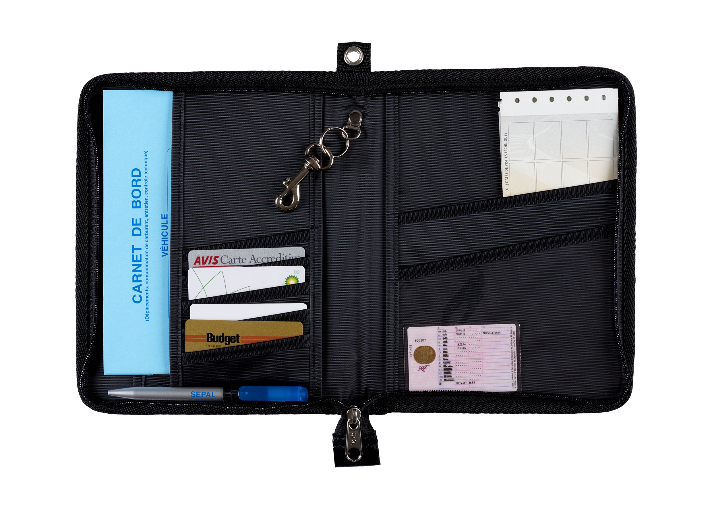 Vous pouvez y stocker non seulement la carte grise et le carnet de bord, mais aussi des cartes de crédit, des badges d’accès, et autres documents administratifs.