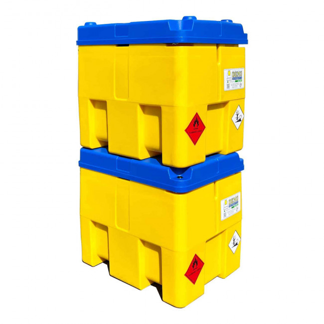 Le couvercle à charnière est doté de deux loquets de sécurité à levier cadenassables (cadenas exclus).