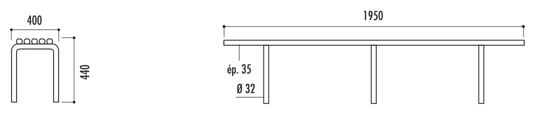 Longueur : 1950 mm Assise en 5 tubes oblong acier Piètement en acier rond À poser