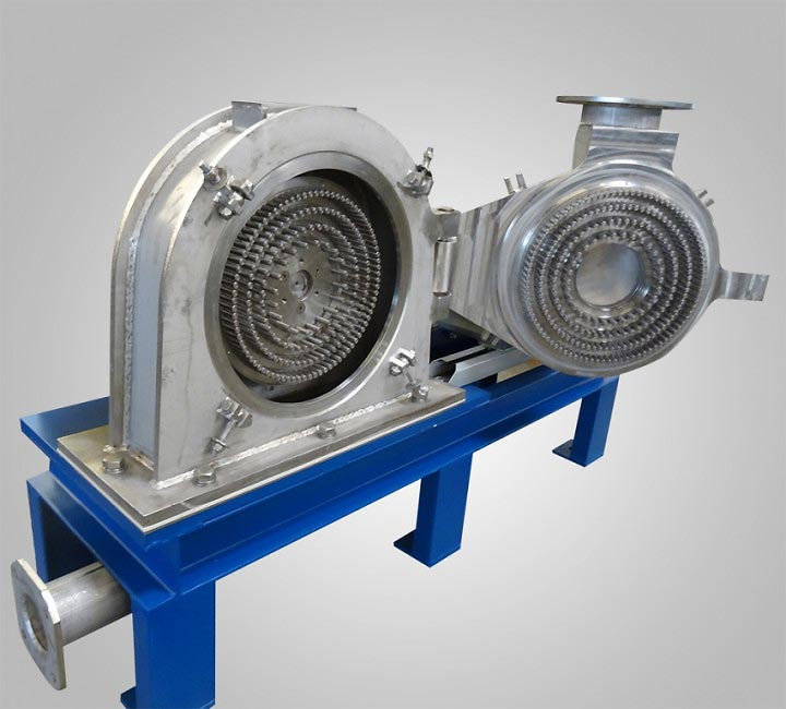 Le produit à broyer est injecté au centre d’un ensemble stator-rotor circulaire vertical.