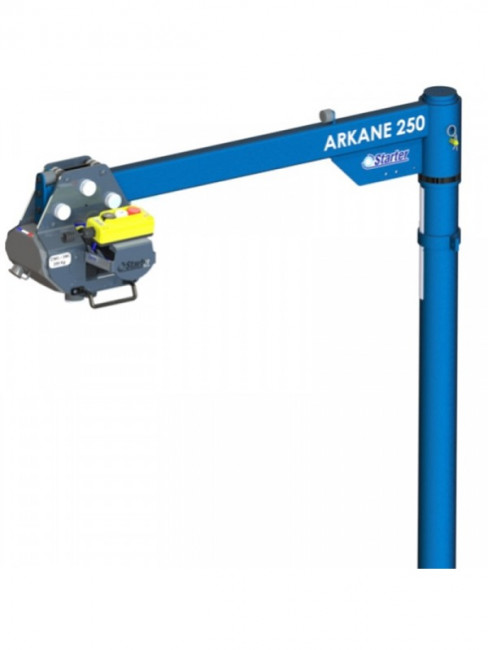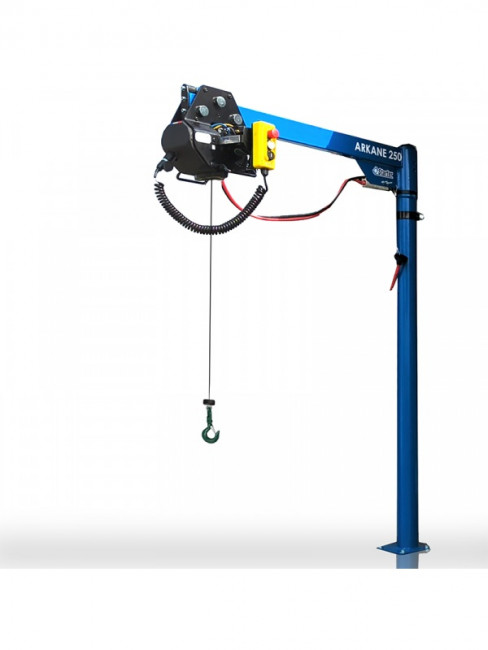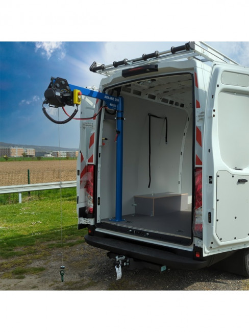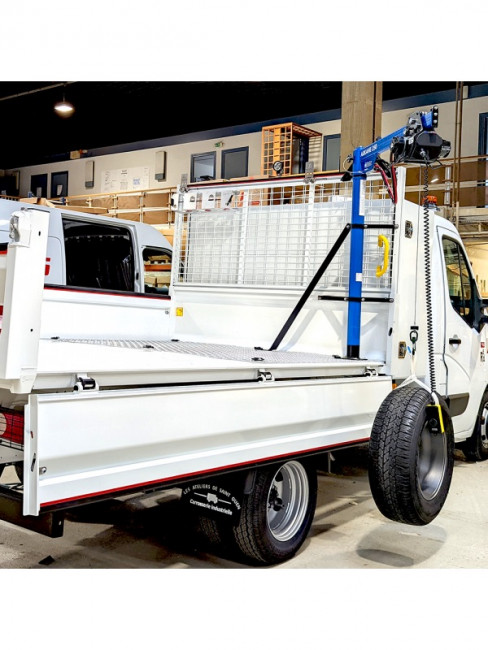 La hauteur du fût réglable de 1,70 mètre permet d'adapter la potence à la hauteur du véhicule et la longueur du bras de 1,10 mètre qui permet d'atteindre une portée suffisante pour déposer la charge au sol ou sur une autre surface.