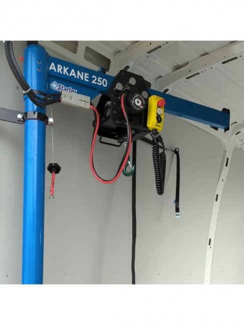 Elle utilise un treuil électrique alimenté par une batterie 12V pour soulever des charges allant jusqu'à 250 kg.