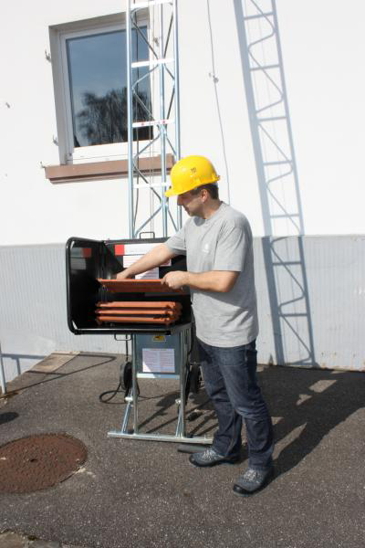 - Assembler le monte-matériaux au sol et mettre en place le support de relevage dans l’ouverture de fenêtre, puis relever le monte-matériaux grâce au treuil et au câble de levage.