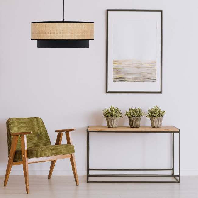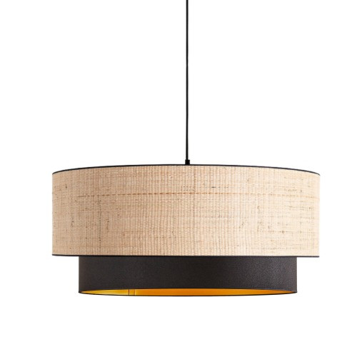 L'association du raphia naturel, du coton et du bordage noir crée un contraste visuel subtil qui attire l'œil et fait de cette suspension un élément de décoration à part entière.