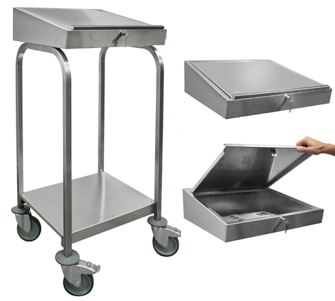 - Pieds : en tube carré inox AISI 304 de 25 x 25 sur 4 roulettes chape zinguée dont 2 à frein