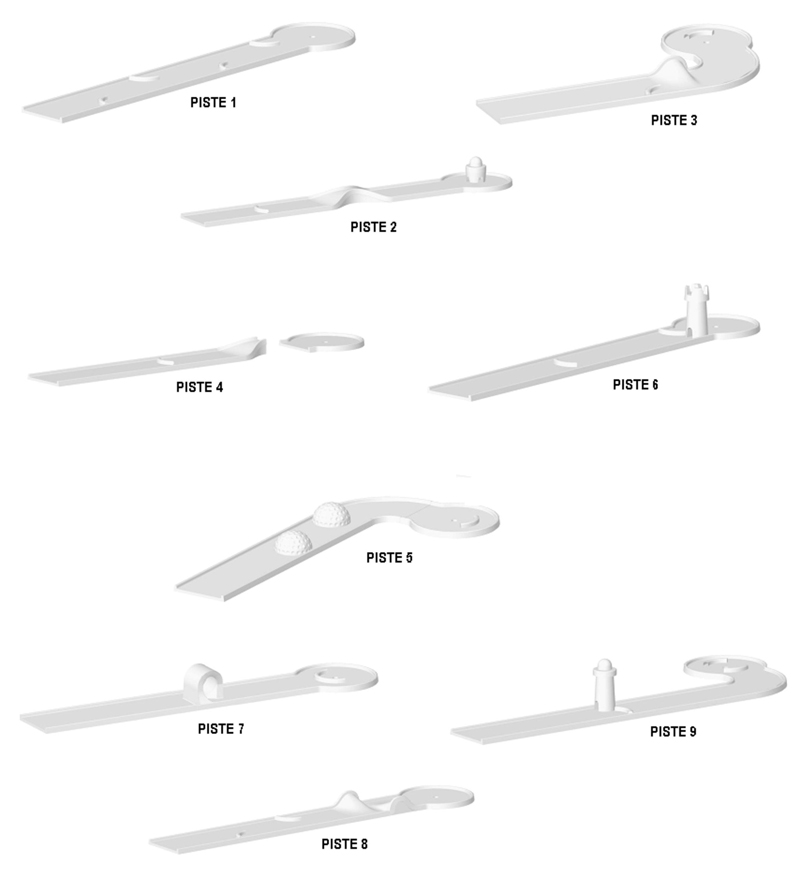 - Le pack mini-golf 9 pistes est composé des pistes de 1 à 9, correspondant à 48 éléments de piste :
