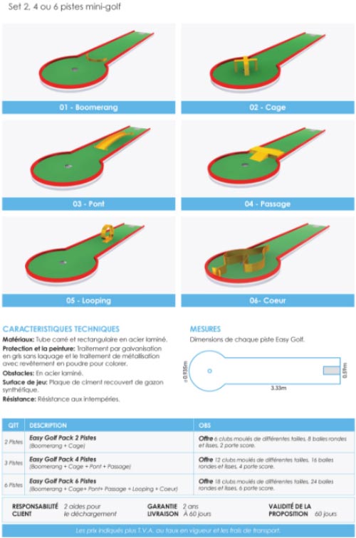 bonjour je souhaite ouvrir un mini golf 18 trous ou 2 mini golfs 12 trous en interieur. Je recherche de preference un kit facile a assembler et a transporter car l"objectif est de l"exporter en Chine. pourriez svp me transmettre un catalogue de produits correspondants, avec theme et les prix? merci et bonne journee Julien Masse
