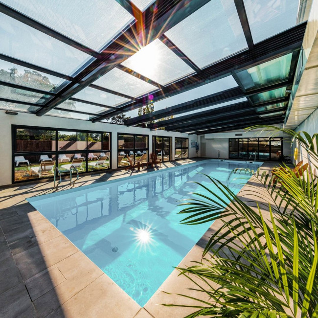 L'actionnement automatique de nos toitures coulissantes par des moteurs de dernière génération, permet à l'ouverture et à la fermeture de vos toits mobiles d'être aussi simple que d'appuyer sur un bouton, à l'image de ce toit mobile installé pour une piscine intérieure d'hôtel.