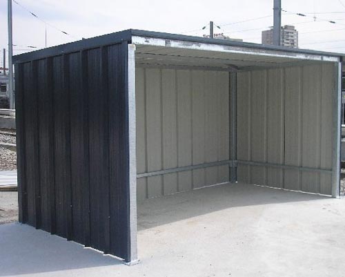 Un abri de 3 ml * 2.5 ml et de hauteur 2.5 ml. Il sera ouvert sur un coté de 3ml. Fixation au sol sur la dalle existante par chevilles males en acier. Structure en acier galvanisée. Les trois murs et la toiture seront recouverts en tôles de type bardage. Pas te traitement des eaux de pluie. Ecoulement des eaux de pluies vers l’arrière de l’abris sans gouttière. Pas de porte d’accès. Pas d’éclairage prévu. Livraison sur BORDEAUX 33