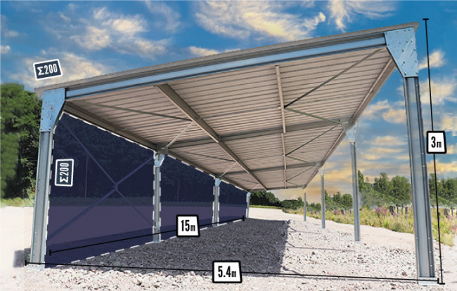 Optez pour notre abri en kit monopente de 81m², sa structure est en acier galvanisé à chaud et sa couverture est en tôles 1er choix à 5 ondes renforcées pour une robustesse et une durabilité exceptionnelles. Offrant une généreuse surface couverte de 81m² pour abriter matériels et véhicules. Un abris en kit facile à installer et disponible immédiatement.