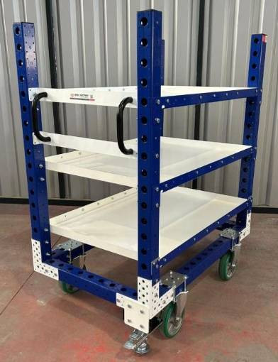 Découvrez notre chariot de kitting mécano-assemblé, conçu pour vos opérations de stockage, de préparation et de prélèvement de pièces en atelier.