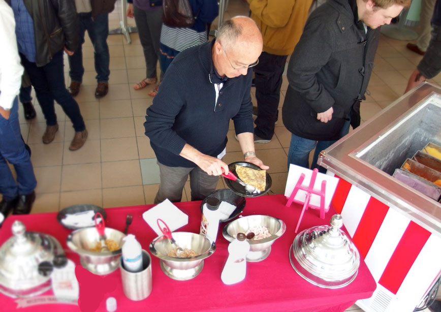 - Les crêpes seront mises en fin de cuisson devant vos invités. À leur demande, elles pourront être agrémentées par le crêpier pendant la cuisson des garnitures suivantes au nombre de deux : Sucre – Nutella – Citron sucre – Pépites de chocolat – Chocolat blanc coco – Crème de marron – Caramel au beurre salé – Sirop d’érable. (Chariot de glaces 9 parfums possible sur demande)