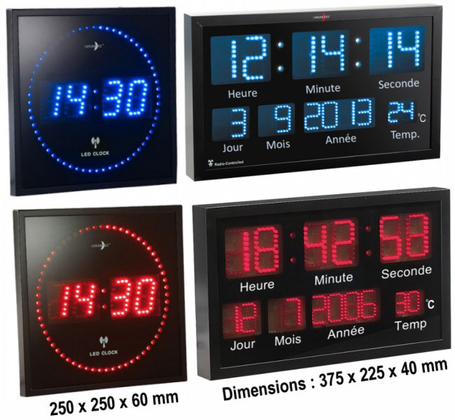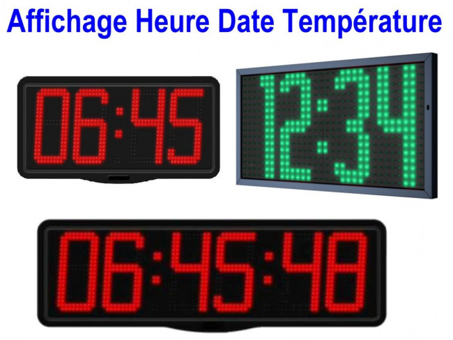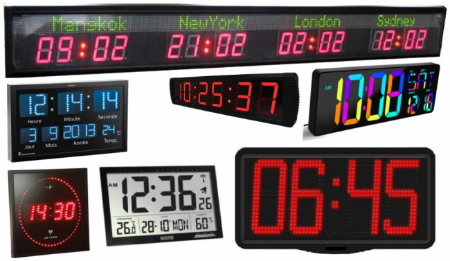 Diffrents types de horloges pour installer en intérieur sous éclairage artificiel, dans des bureaux, des commerces ou tous lieux public.Les versions LCD peuvent être aliment&e