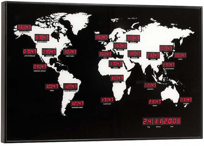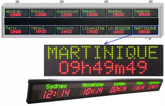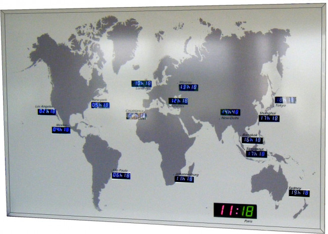 Nous proposons aussi des panneaux d'affichages de fuseaux horaires personnalisés, et ansi que des panneaux d'affichages de cartes du monde indiquant l'heure dans les principales capitales.