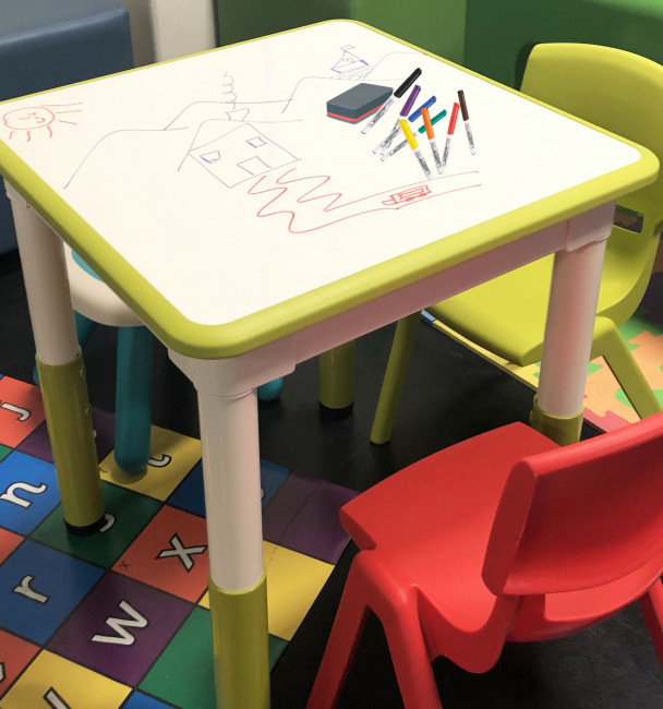 JUK 084C est une table carrée pour écrire et dessiner comme sur le papier permettant aux enfants de la maternelle d’exprimer pleinement leur créativité. Son entretien est très facile (nettoyage à sec).
