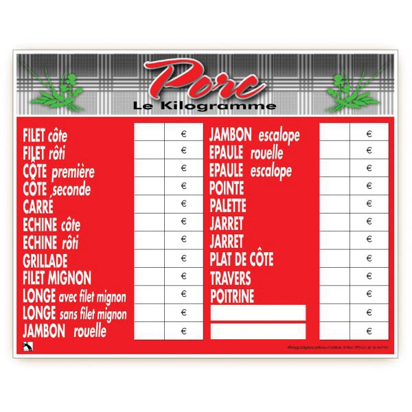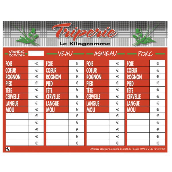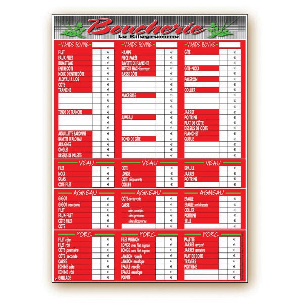 tableau affichage prix complet boeuf/ agneau / porc / veau