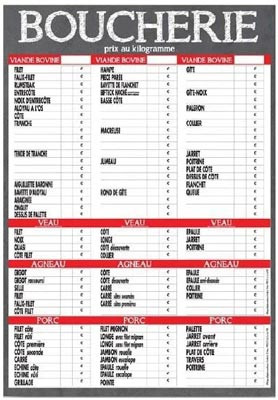 Un panneau qui communique aux clients les tarifs de la viande (bovine, Veau, Agneau, Porc).