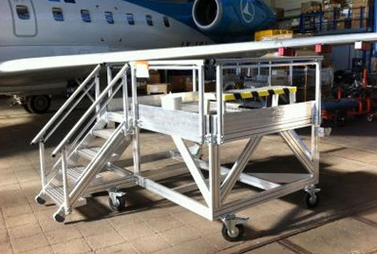 Cet escabeau d'accès permet de répondre aux contraintes d’accès aux trains d’atterrissage dans les domaines de la fabrication et de la maintenance en aviation civile, militaire et d’affaires.