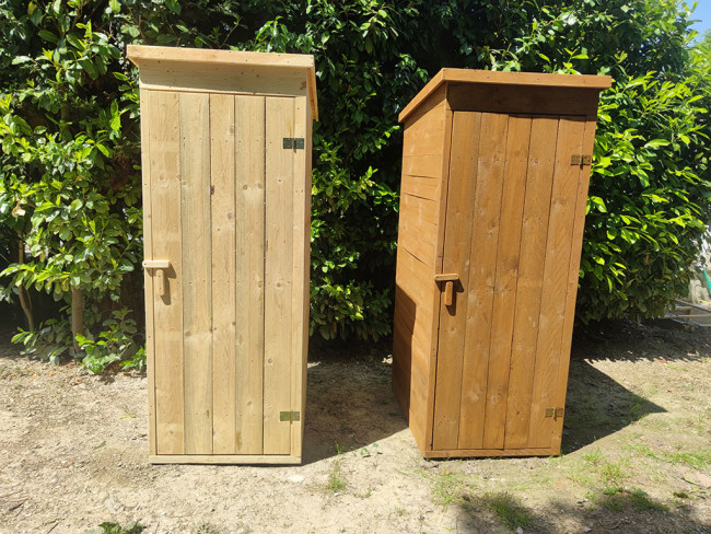 Fabriquées en lames de pin massif de 20 mm d'épaisseur, les surfaces intérieures et extérieures de votre toilette sèche sont brutes et prêtes à recevoir le traitement de votre choix : huile, lasure, peinture, etc.