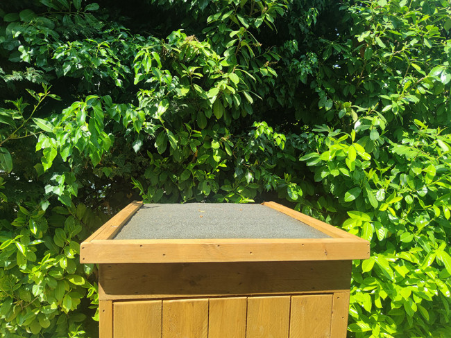 Matériaux : Lames de pin massif de 20 mm, toiture en bardeaux bitumeux, visseries et quincailleries en acier.