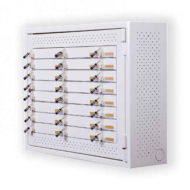 Elle intègre 16 casiers dédiés aux tablettes et 8 casiers réservés aux téléphones.