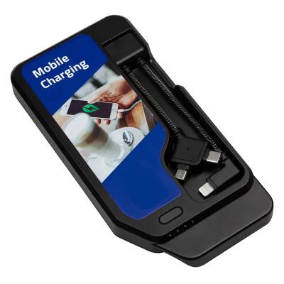 Notre station de charge pour batterie de secours S12B-FR intègre 12 batteries de secours d’une capacité de 10 000 mAh (DC 5V – 2A). Chaque batterie dispose d’une triple connectique intégrée et d’un témoin de charge à LED. La recharge automatique s’effectue via une connectique propriétaire, sans branchement manuel. La station est à poser et affiche des dimensions de 340 x 240 x 180 mm (HxLxP). La personnalisation de la station et des batteries est possible.